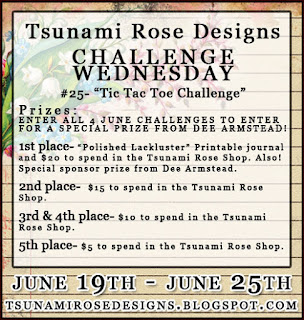 Thank you for joining us for our 25th Wednesday Challenge at Tsunami Rose. This weeks challenge was to create a project using the Tic Tac Toe board presented below. The project required the use of three embellishments that formed a straight line.
